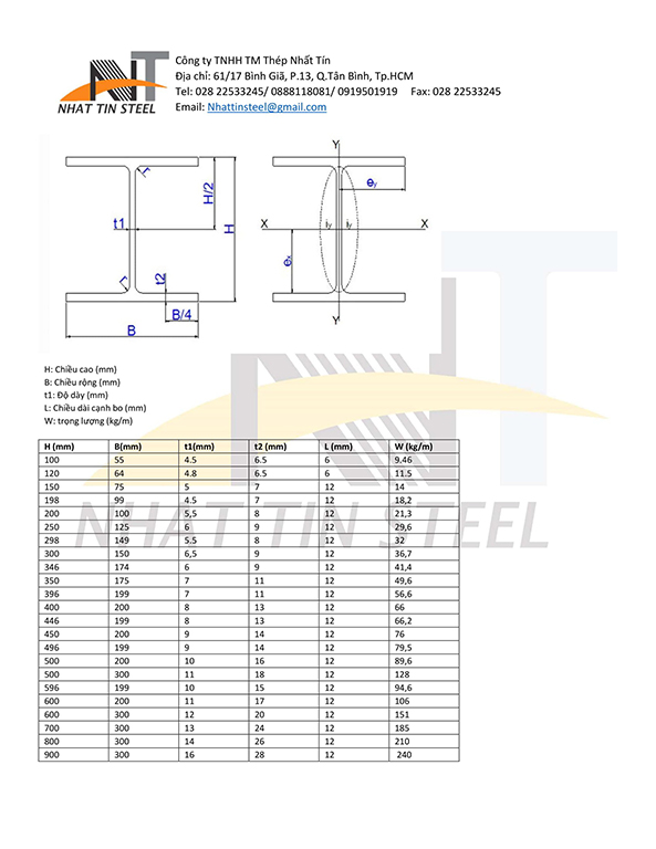 . Thép hình H gần như giống thép I, nhưng chỉ khác là 3 cạnh bằng nhau. Chiều cao thân từ 100-900mm chiều rộng cánh từ 50-400mm. Có độ dài thông dụng là 6m hoặc 12m