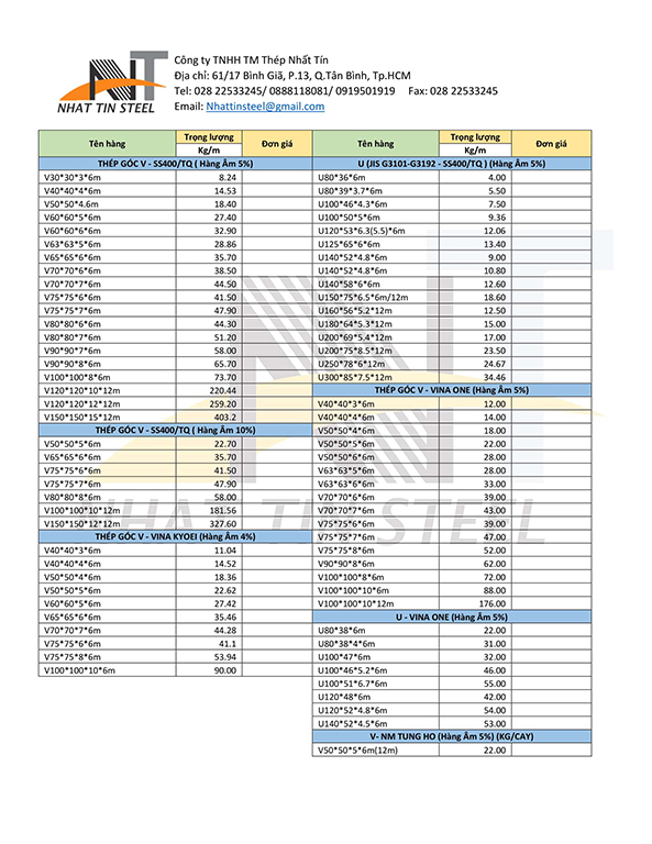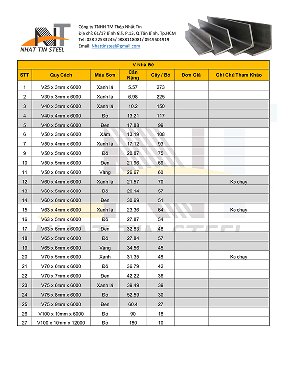 . Trên thị trường thông dụng nhất là thép V - Nhà Bè, V - An Khánh. Ngoài ra thép V - Tổ hợp, phù hợp cho công trình nhỏ nhờ giá cạnh tranh. Và thép V - Trung Quốc có quy cách, độ dày lớn, thích hợp cho các công trình lớn. |
