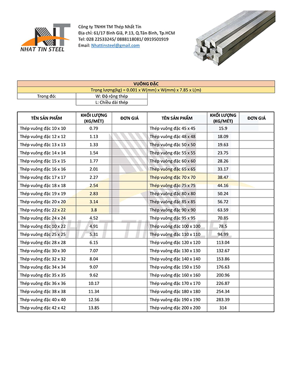 Thép Vuông đặc có nhiều kích cỡ từ thép vuông 10 đến thép vuông 100 và có thể cắt theo yêu cầu. Đặc biệt, có hàng size lớn đến Vuông 100x100, 120x120, 150x150, 200 x 200, 210 x 210, 300 x 300 ... Vuông lớn nhất 500 x 500 (phôi cắt gió đá). |